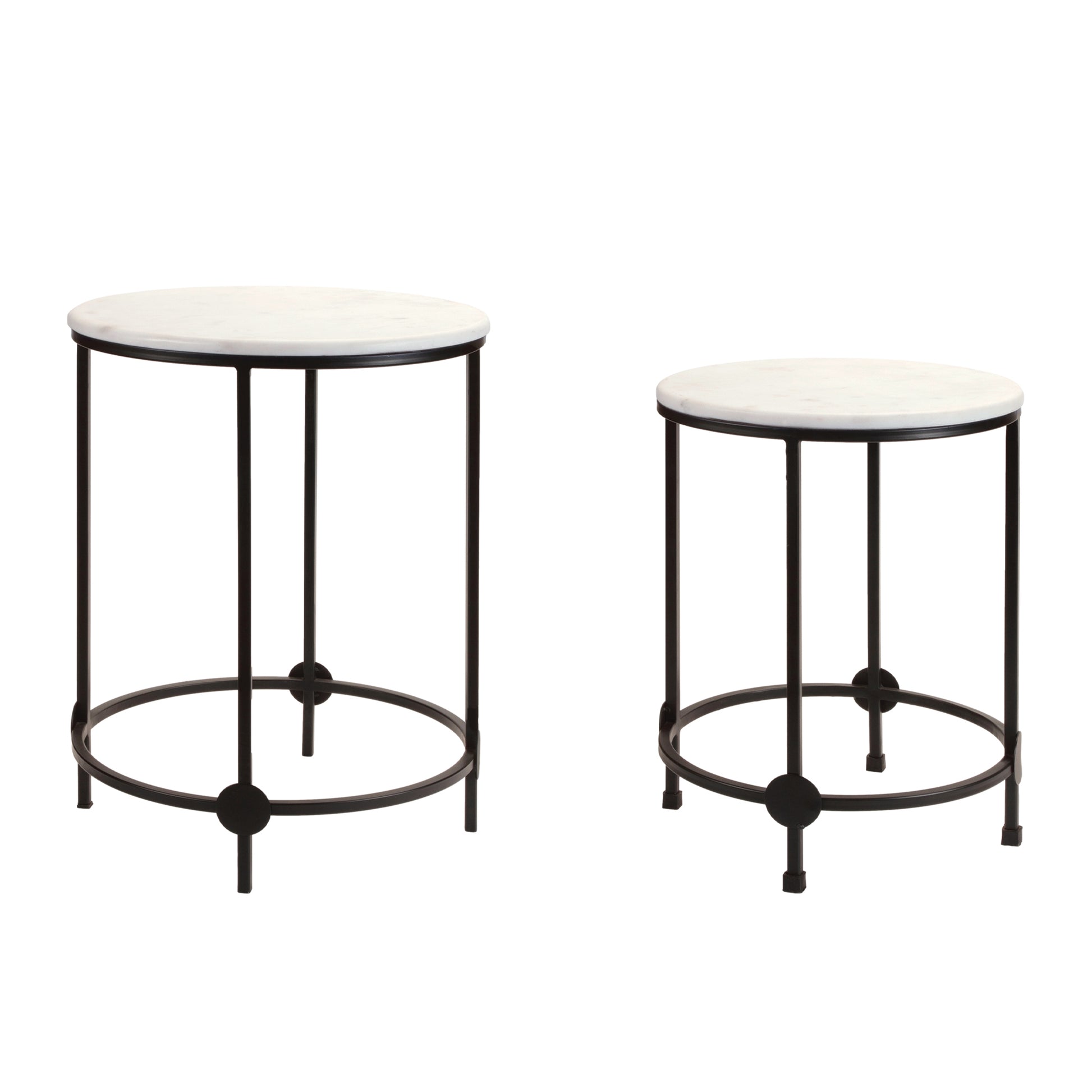 Elevate your space with the Round Marble Top Accent Table Set. Featuring modern black and white tones these tables showcase a luxurious natural marble stone finish on the tops complemented by sturdy iron metal legs with a stylish ring accent. The set includes two nesting tables in varying sizes offering versatility in your home decor. Perfect for displaying floral vases decorative accents or personal treasures these tables make a sophisticated addition to your living room entryway or any contemporary space.