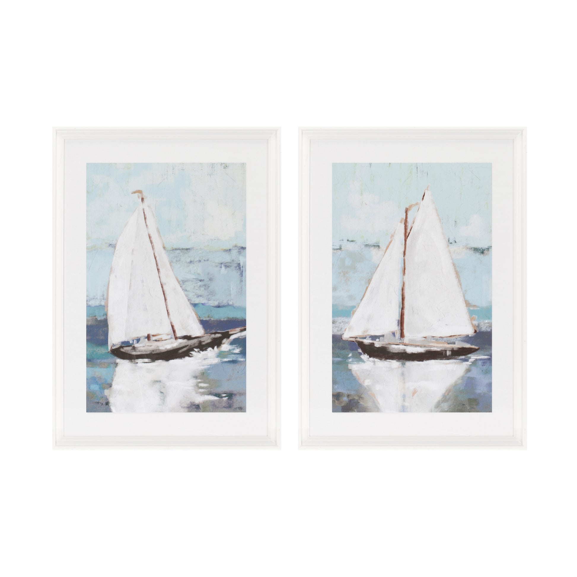 Bring the serenity of the sea to your space with this Framed Sail Boat Print. Featuring cool blue and white tones these modern sailboat prints are framed with a crisp white wooden border adding a coastal touch to your décor. Sold in a set of two assorted designs each print is complemented by a delicate white matte outline that enhances the clean nautical aesthetic. Each piece comes with two D-ring hangers on the back for securing them safely to the walls of your home. Perfect for your coastal nautical or lakehouse décor these prints will fill your walls with a calming maritime charm.